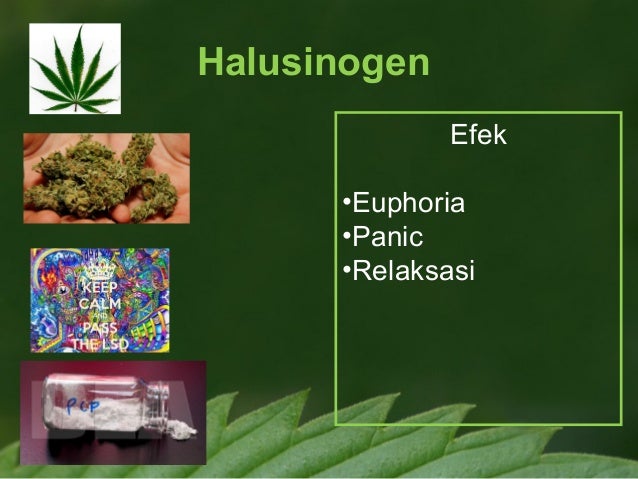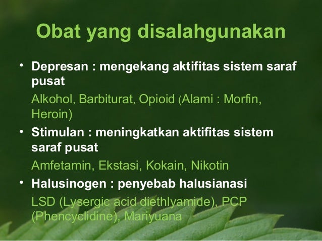 · Obat yang disalahgunakan • Depresan : mengekang aktifitas sistem saraf pusat Alkohol, Barbiturat, Opioid (Alami : Morfin, Heroin) • Stimulan : meningkatkan aktifitas sistem saraf pusat Amfetamin, Ekstasi, Kokain, Nikotin • Halusinogen : penyebab halusianasi LSD (Lysergic acid diethlyamide), PCP (Phencyclidine), Mariyuana