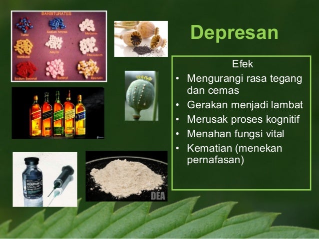 · Depresan Efek • Mengurangi rasa tegang dan cemas • Gerakan menjadi lambat • Merusak proses kognitif • Menahan fungsi vital • Kematian (menekan pernafasan)