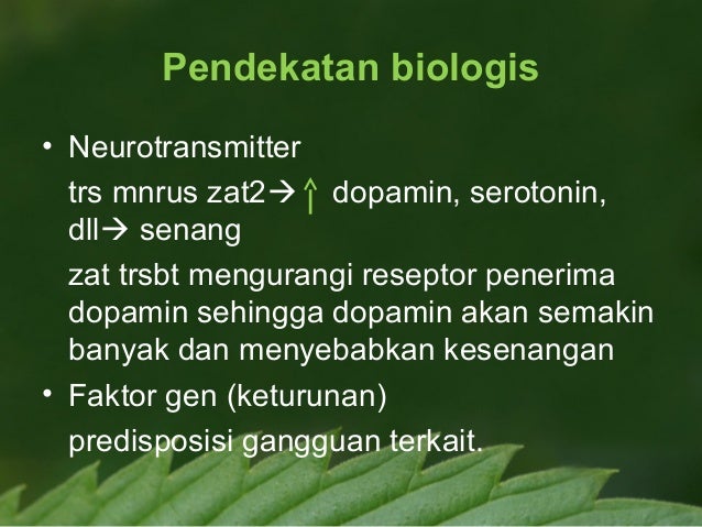 · Pendekatan biologis • Neurotransmitter trs mnrus zat2à dopamin, serotonin, dllà senang zat trsbt mengurangi reseptor penerima dopamin sehingga dopamin akan semakin banyak dan menyebabkan kesenangan • Faktor gen (keturunan) predisposisi gangguan terkait.