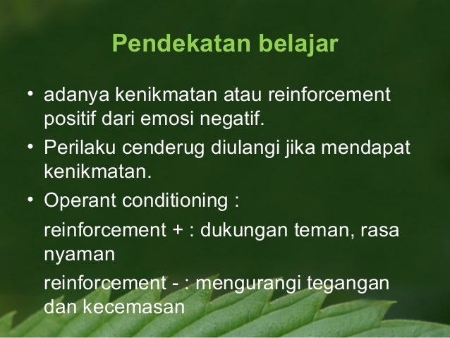 · Pendekatan belajar • adanya kenikmatan atau reinforcement positif dari emosi negatif. • Perilaku cenderug diulangi jika mendapat kenikmatan. • Operant conditioning : reinforcement + : dukungan teman, rasa nyaman reinforcement - : mengurangi tegangan dan kecemasan
