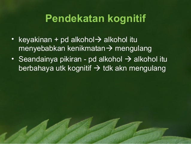 · Pendekatan kognitif • keyakinan + pd alkoholà alkohol itu menyebabkan kenikmatanà mengulang • Seandainya pikiran - pd alkohol à alkohol itu berbahaya utk kognitif à tdk akn mengulang