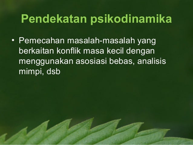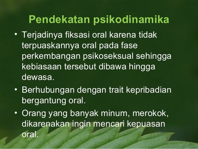 · Pendekatan psikodinamika • Terjadinya fiksasi oral karena tidak terpuaskannya oral pada fase perkembangan psikoseksual sehingga kebiasaan tersebut dibawa hingga dewasa. • Berhubungan dengan trait kepribadian bergantung oral. • Orang yang banyak minum, merokok, dikarenakan ingin mencari kepuasan oral.