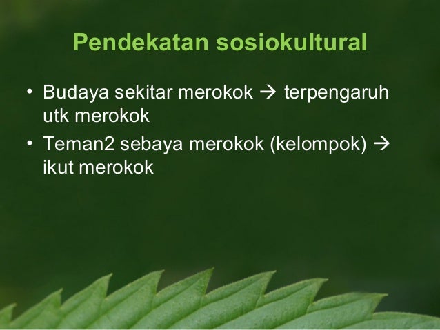 · Pendekatan sosiokultural • Budaya sekitar merokok à terpengaruh utk merokok • Teman2 sebaya merokok (kelompok) à ikut merokok