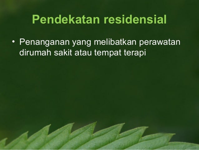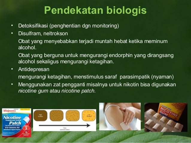 · Pendekatan biologis • Detoksifikasi (penghentian dgn monitoring) • Disulfram, neltrokson Obat yang menyebabkan terjadi muntah hebat ketika meminum alcohol. Obat yang berguna untuk mengurangi endorphin yang dirangsang alcohol sekaligus mengurangi ketagihan. • Antidepresan mengurangi ketagihan, menstimulus saraf parasimpatik (nyaman) • Menggunakan zat pengganti misalnya untuk nikotin bisa digunakan nicotine gum atau nicotine patch.