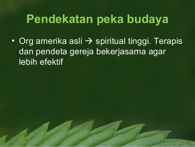 · Pendekatan peka budaya • Org amerika asli à spiritual tinggi. Terapis dan pendeta gereja bekerjasama agar lebih efektif