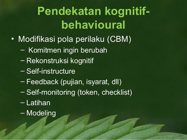 • Modifikasi pola perilaku (CBM) – Komitmen ingin berubah – Rekonstruksi kognitif – Self-instructure – Feedback (pujian, isyarat, dll) – Self-monitoring (token, checklist) – Latihan – Modeling