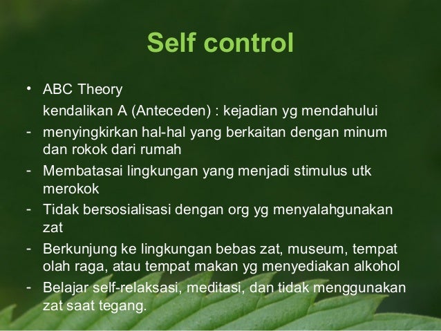 • ABC Theory kendalikan A (Anteceden) : kejadian yg mendahului - menyingkirkan hal-hal yang berkaitan dengan minum dan rokok dari rumah - Membatasai lingkungan yang menjadi