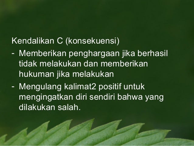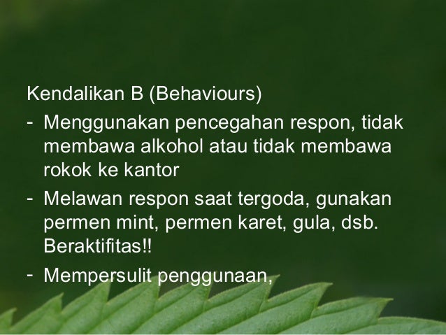 · Kendalikan B (Behaviours) - Menggunakan pencegahan respon, tidak membawa alkohol atau tidak membawa rokok ke kantor - Melawan respon saat tergoda, gunakan permen mint, permen karet,