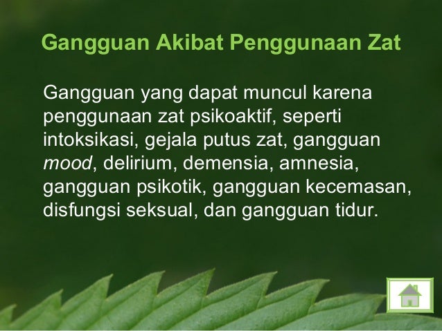 · Gangguan Akibat Penggunaan Zat Gangguan yang dapat muncul karena penggunaan zat psikoaktif, seperti intoksikasi, gejala putus zat, gangguan mood, delirium, demensia, amnesia, gangguan psikotik, gangguan kecemasan, disfungsi seksual, dan gangguan tidur.