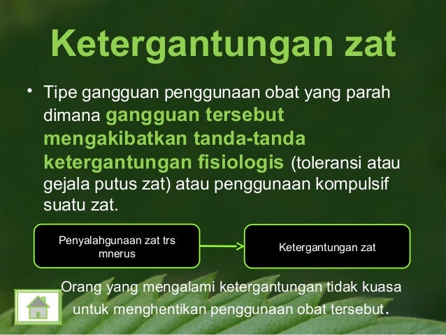 • Tipe gangguan penggunaan obat yang parah dimana gangguan tersebut mengakibatkan tanda-tanda ketergantungan fisiologis (toleransi atau gejala putus zat) atau penggunaan kompulsif suatu zat. Penyalahgunaan zat trs mnerus Ketergantungan zat Orang yang mengalami ketergantungan tidak kuasa untuk menghentikan penggunaan obat tersebut.