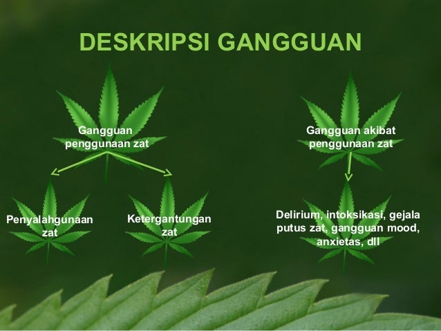 · DESKRIPSI GANGGUAN Gangguan penggunaan zat Gangguan akibat penggunaan zat Penyalahgunaan zat Ketergantungan zat Delirium, intoksikasi, gejala putus zat, gangguan mood, anxietas, dll