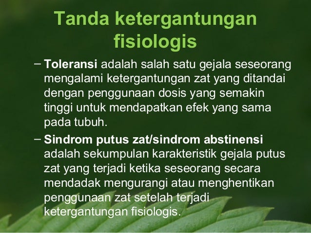 · Tanda ketergantungan fisiologis – Toleransi adalah salah satu gejala seseorang mengalami ketergantungan zat yang ditandai dengan penggunaan dosis yang semakin tinggi untuk mendapatkan efek yang sama pada tubuh. – Sindrom putus zat/sindrom abstinensi adalah sekumpulan karakteristik gejala putus zat yang terjadi ketika seseorang secara mendadak mengurangi atau menghentikan penggunaan zat setelah terjadi ketergantungan fisiologis.